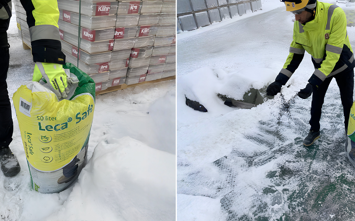 Det er gjennomført flere tester med ulike strømaterialer for sklisikkerhet – sand, singel, grus og salt. Det materialet som viste klart best effekt, var LECA-strøkuler. De gir betydelig bedre grep, er lette å håndtere og fungerer optimalt på HMS-gulvet under krevende vinterforhold.
